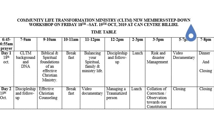 CLTM is organizing a workshop on Friday 18th – Saturday 19th October 2019 @ CAN Centre Billiri, for new members and leaders who stepped down.